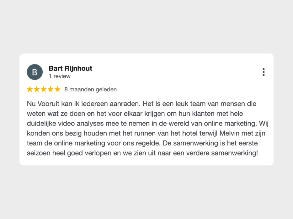 Het team van Nu Vooruit heeft vanaf de start alles duidelijk en stap voor stap met ons doorgenomen. Wij hebben onze kennis van de regio, markt en hotelbranche gedeeld en Nu Vooruit heeft met deze informatie een heldere en duidelijke vertaalslag gemaakt naar de online campagnes. Met enige regelmaat heeft Nu Vooruit een video gestuurd waarin duidelijk wordt uitgelegd wat er in de afgelopen periode goed is gegaan en waar nog aan gewerkt moet worden. Naar aanleiding van deze video’s hebben wij onze analyse van de cijfers gedeeld en hebben we in overleg de strategie en het budget voor de komende periode afgestemd.